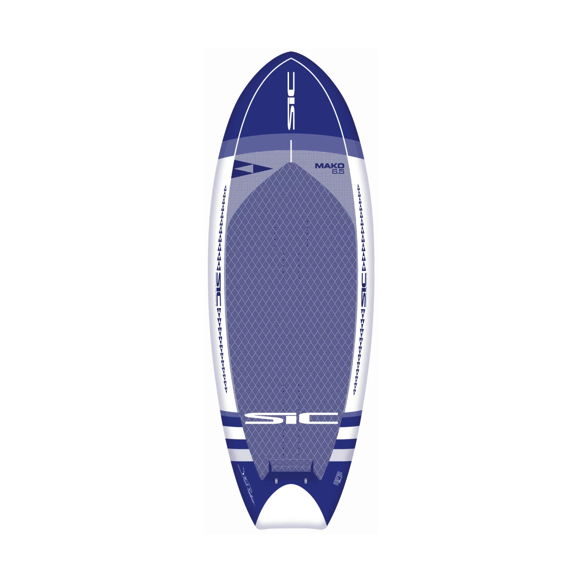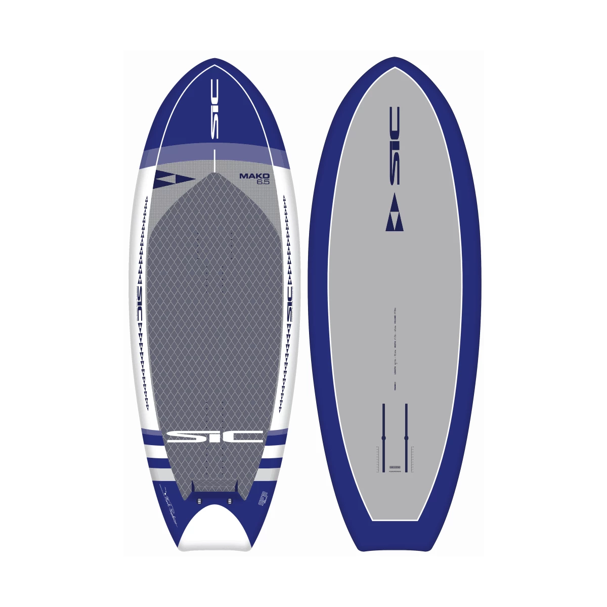 Mako 6’5″ er lidt smallere end Manta 6’0″ men har 10 liter mere volumen for at understøtte padlerens stående vægt. Næsen har et mere slankt og spidst design for at være mere tilgivende og for at overfladen hurtigere, hvis brættet perler. Den generelle dimension og skumflowfordeling forbedrer stabiliteten for og bag, og bundskinnene hjælper med at afbøde brættet, når du rører ned og under stejle sving. Det konturformede dæk øger side-til-side stabilitet. Tavlen fungerer fantastisk både som SUP og vingefoliebræt.
